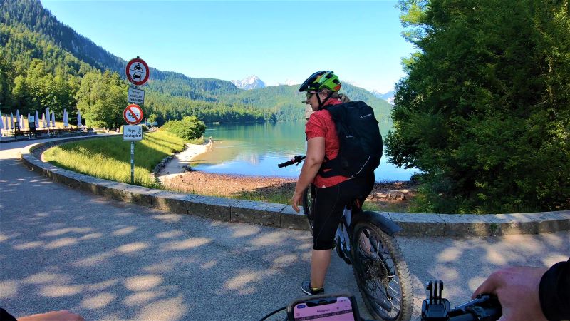 Wir dürfen von unten einen Blick hinauf zum Schloss Neuschwanstein erhaschen, das wir aber wörtlich und bildlich gesprochen „links liegenlassen“. Es ist zum Glück noch früh am Tag und nicht viel los, der Trubel beginnt aber sicherlich bald. Diese Tour hat andere Schwerpunkte. Wir fahren weiter durch Hohenschwangau. Am Ortsende erreichen wir den Alpsee, wo wir in Fahrtrichtung gesehen dem rechten Uferweg folgen, der See liegt links von uns im weiteren Verlauf.