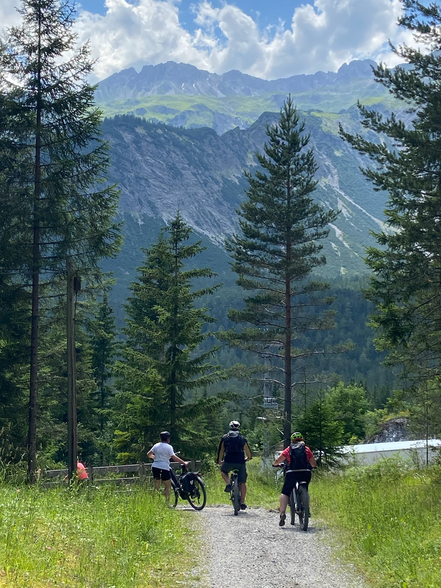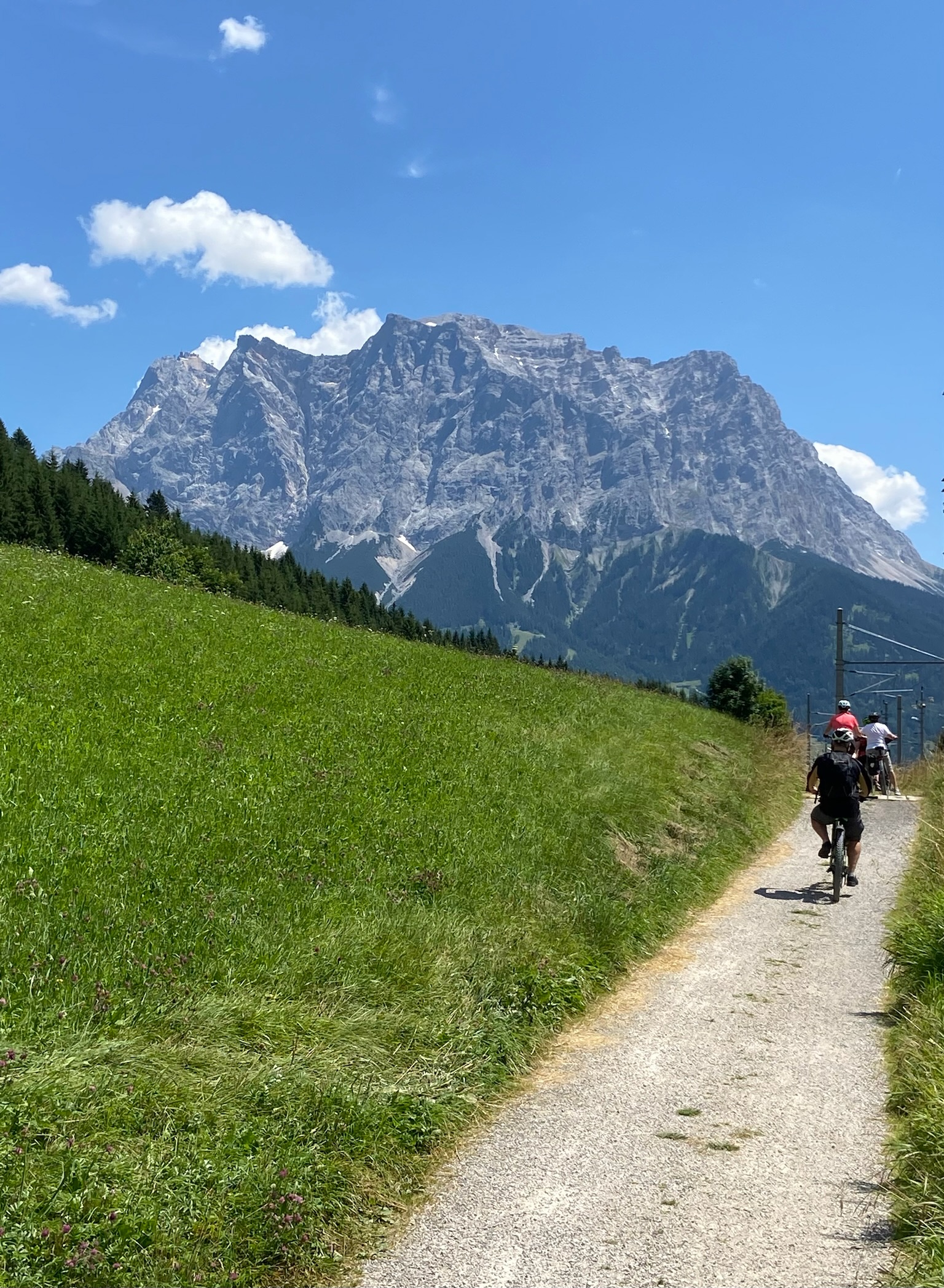 Dank hervorragender Fernsicht an diesem Tag haben wir in Lermoos einen tollen Blick in Fahrtrichtung auf das Zugspitzmassiv – beeindruckend, wie der komplette Tourtag.