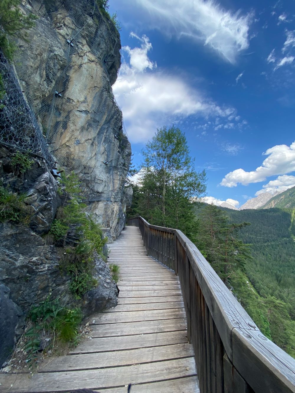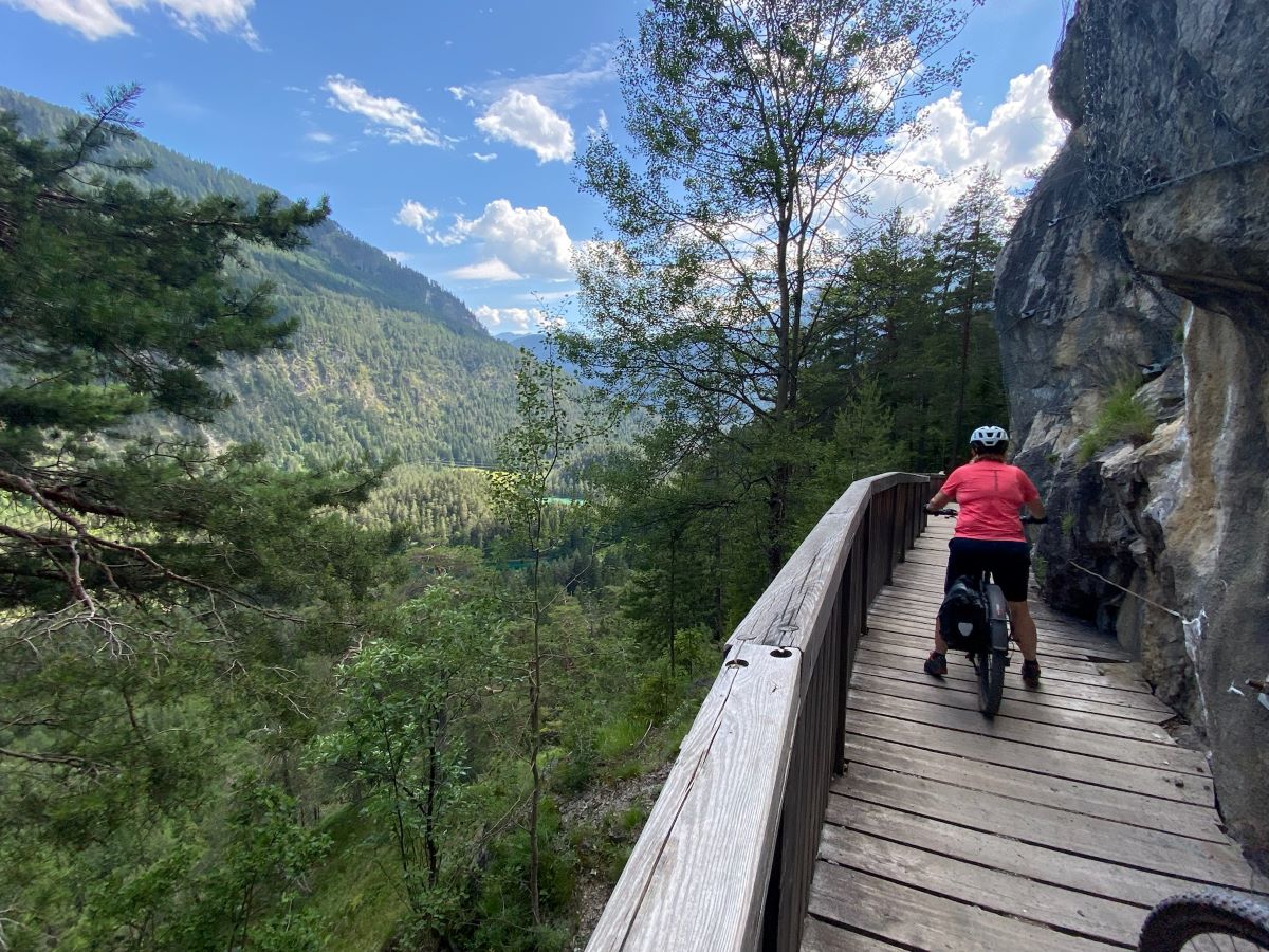 Der Weg über den Fernpass zeichnet sich durch einen im wesentlichen stetigen, durchaus teilweise markanten Anstieg aus. Der Untergrund besteht größtenteils aus Schotter, teilweise relativ grob und nicht verfestigt. Kurz nach dem höchsten Punkt erreicht man die Schlüsselstelle dieser Etappe. Es geht über eine Holzbrüstung und in der Folge über den alten Römerweg in Serpentinen bergab, für Trekkingradverhältnisse relativ steil. Der Weg ist nicht allzu breit, teilweise mit ausgewaschenen Rinnen versehen und mit kleinen Stufen und Blöcken durchsetzt. Hier muss man schon ein bisschen aufpassen – wer sich das nicht zutraut, sollte vielleicht lieber die wenigen hundert Meter sein Rad schieben. Unsere Mitfahrerin mit Trekkingrad hat das so gehandhabt – kein Problem, kein großer Aufwand. Auch weiter unten in der Abfahrt gibt es immer mal wieder solche Stellen, an denen man vorsichtig agieren sollte, machbar ist es aber, notfalls halt, wie geschrieben, laufend.
