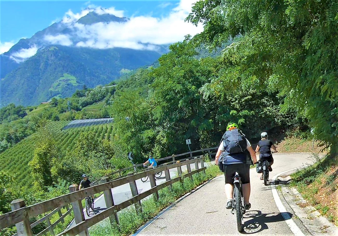 Wir vermeiden übrigens meistens schon ab Meran die normale Radroute auf dem Etschdamm und fahren über Lana, Nals, Andrian und Pillhof auf der Weinstraße bis Frangart. Auch dort fährt man bis Lana und Richtung Andrian einige Höhenmeter sanft bergauf.