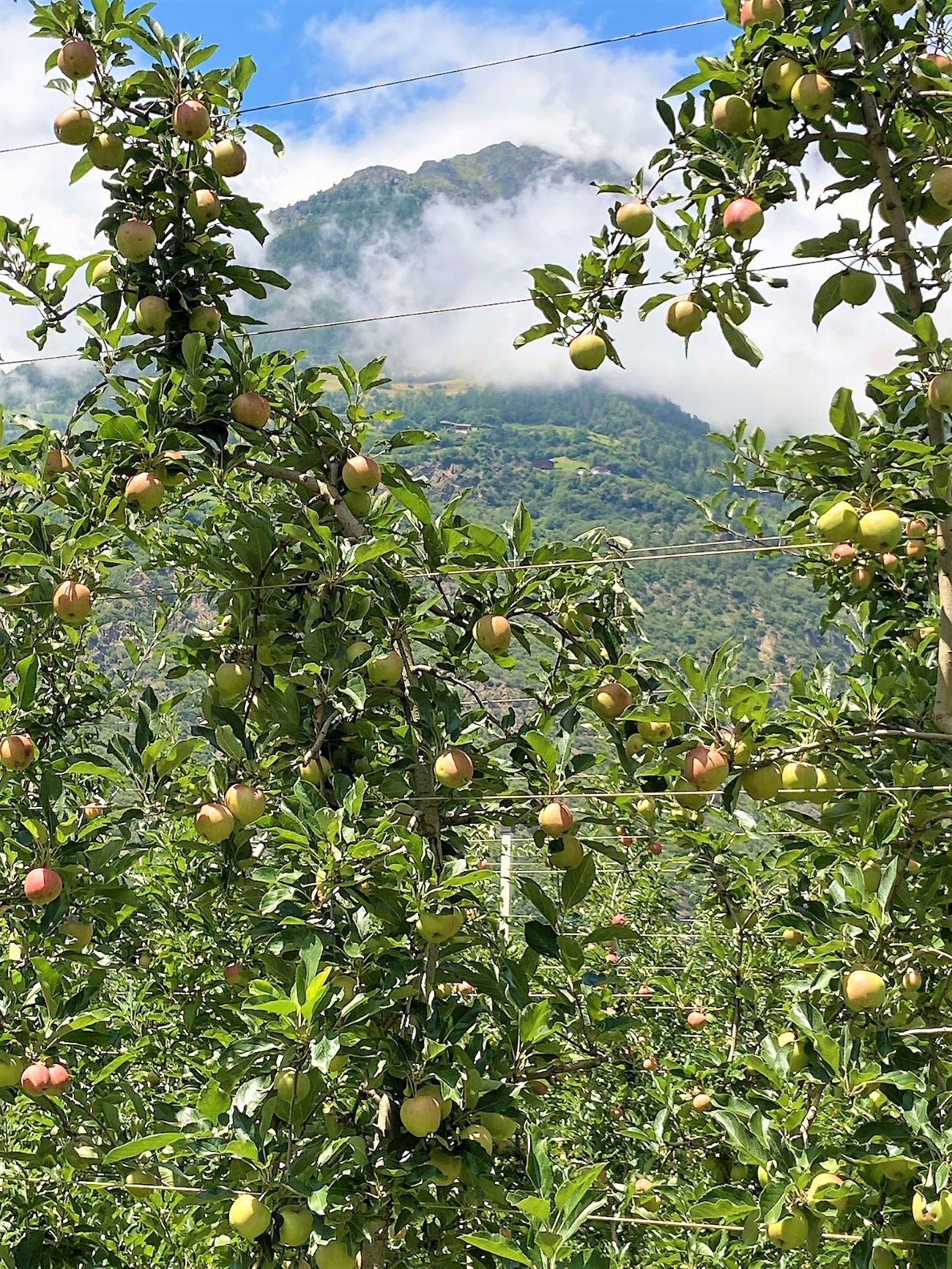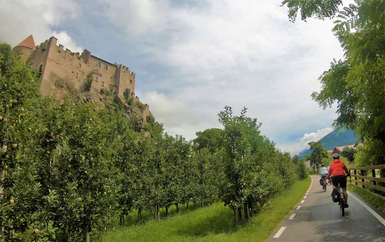 Mit dem Fortsetzen der Tour hinter Meran auf der klassischen Route der Via Claudia Augusta behält der Radweg seine grundlegende Charakteristik. Hervorragend ausgebaut, getrennt vom übrigen Verkehr. Eigentlich alles super, oder? Ein paar entscheidende Parameter ändern sich aber irgendwie in der Wahrnehmung doch. Das Tal wird weiter, was dazu führt, dass die Berge nun weiter weg sind. Immer noch eine schöne Kulisse, zweifellos, aber durch die Entfernung ändert sich die Aussicht nur sehr langsam, um nicht zu sagen zäh. Die Etsch ist hier begradigt, ebenso ist das auch dem Radweg widerfahren. Wir haben uns an den Apfelplantagen reichlich satt gesehen.