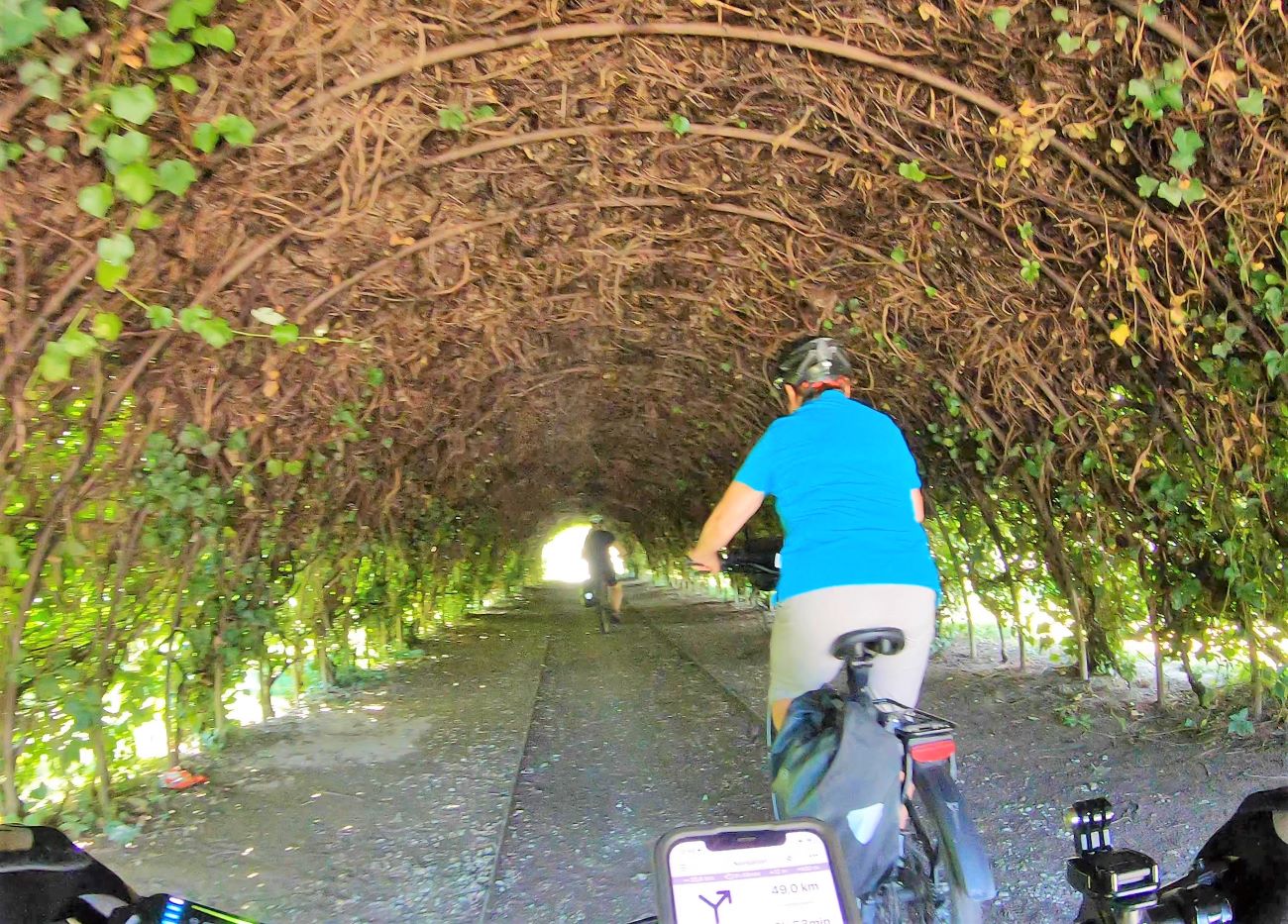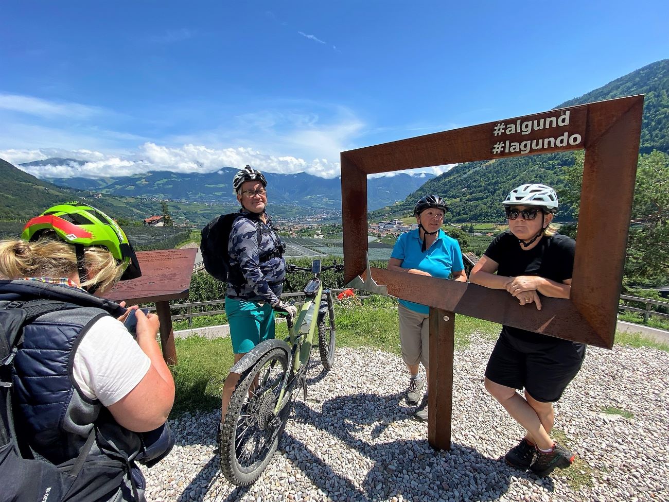 So kommen wir relativ entspannt voran. In Algund, bereits kurz vor Meran, halten wir an einem Aussichtspunkt, zu dem man durch eine Art berankte Röhre gelangt – der Abzweig ist von der offiziellen Radroute aus gut zu erkennen.