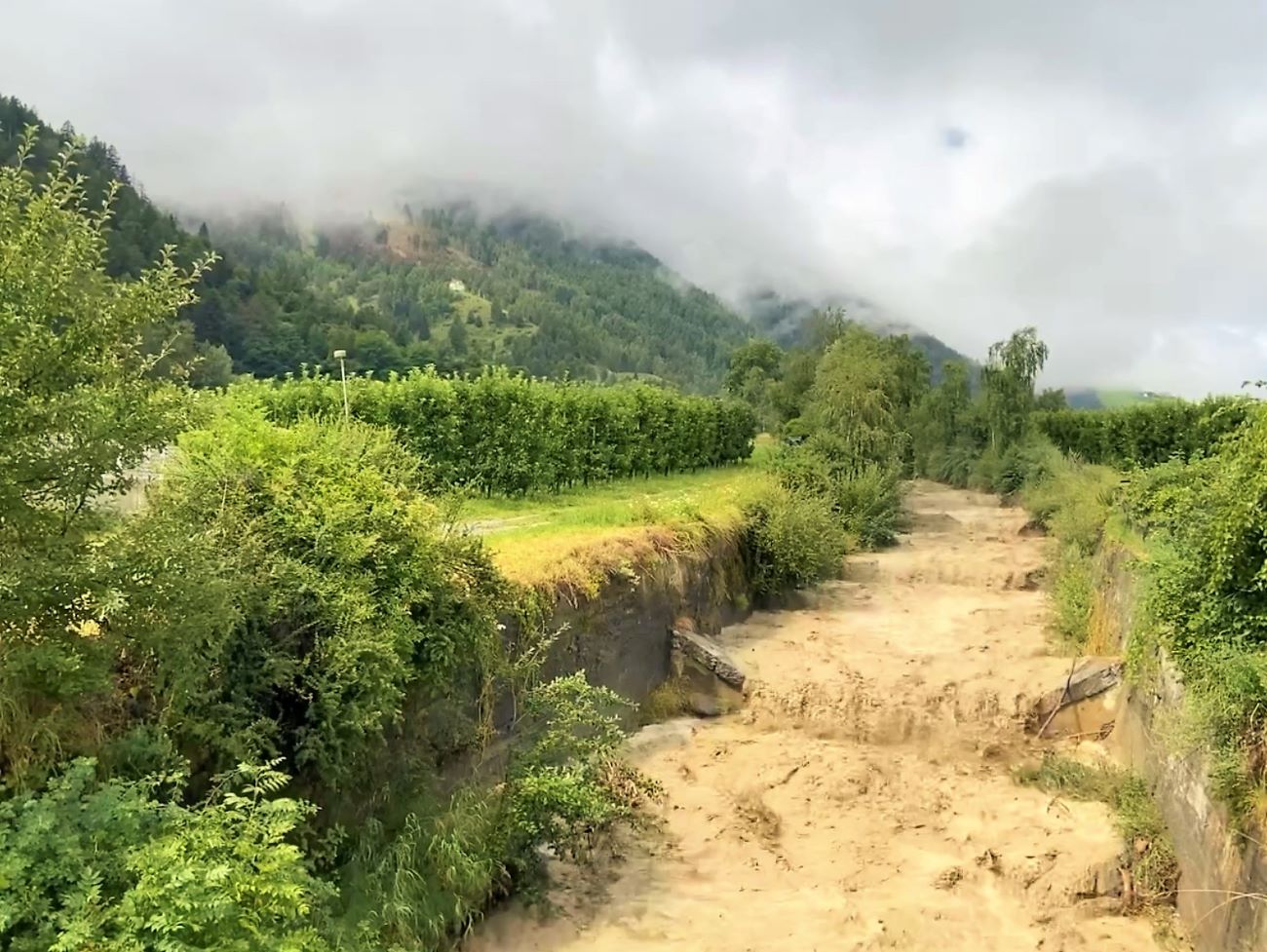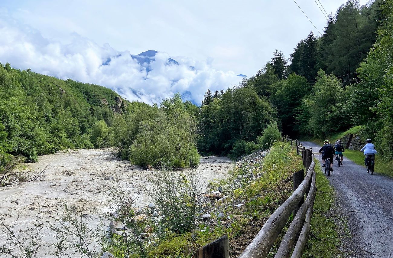 Tatsächlich verzogen sich die Wolken gegen 11:00 Uhr recht schnell, und wir konnten starten. Die Etsch, am Tag zuvor ein Rinnsal, zwischen Steinen klares Wasser führend und sanft dahin fließend, hatte über Nacht ihren Charakter komplett geändert. Wir fanden nun einen laut grollenden, ganze Baumstämme mit sich führenden, schmutzig braun-schwarzen reißenden Fluss vor. Beeindruckende Wasserwalzen wirbelten mitgerissene Holzstücke umher.