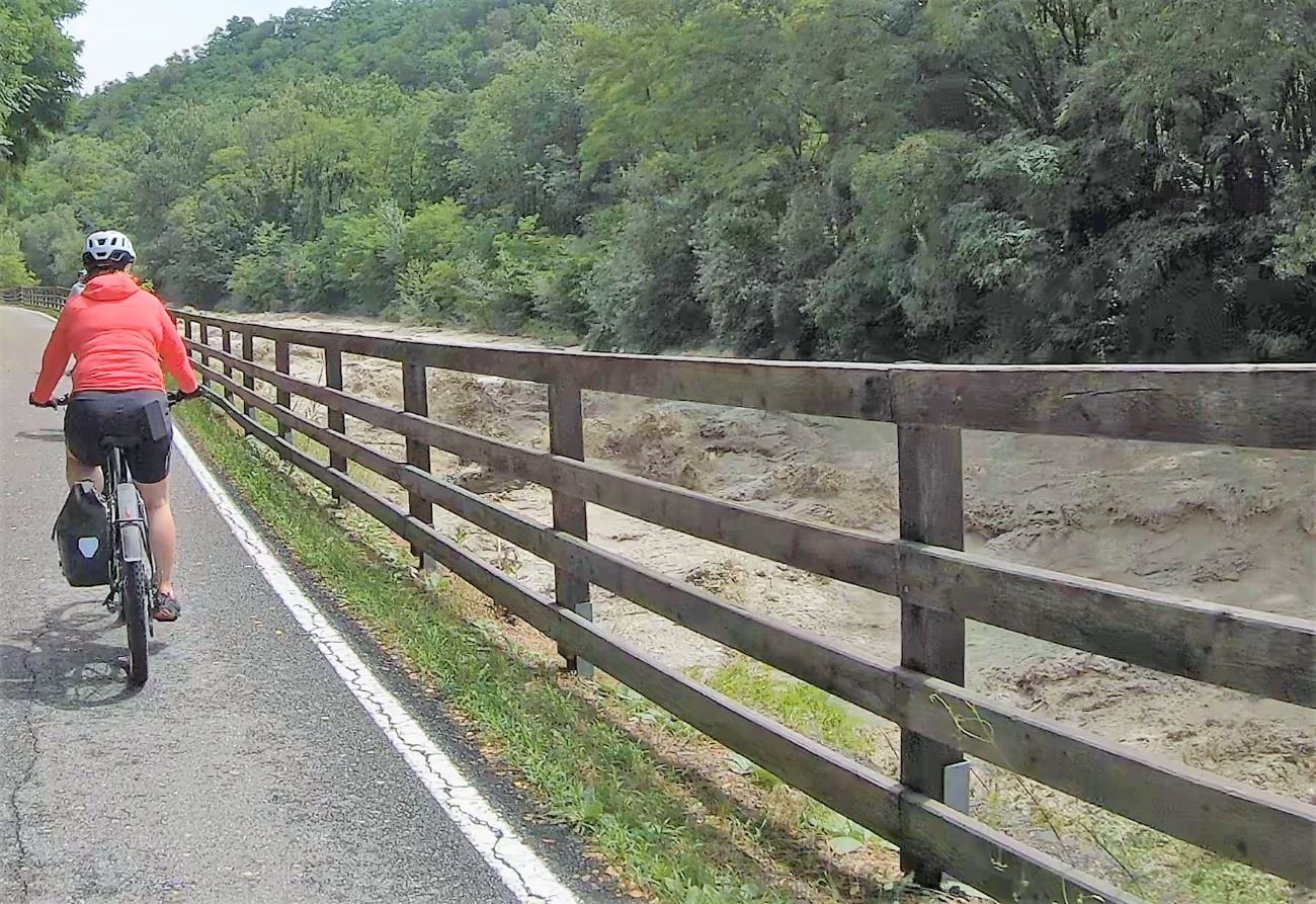 Alles das zusammen führt dazu, dass wir nach einigen Kilometern schnurgerader Asphaltpiste, rechts die Etsch, links ein grüner Metallzaun, daneben die Bahnlinie, nicht mehr wollen. Mag auch sein, dass einfach der Kontrast zu den intensiven Erlebnissen der Vortage zu stark ist. Kurzerhand beschließen wir auf die höhergelegene kleine Nebenstraße in Fahrtrichtung gesehen rechts von der Etsch auszuweichen und über die kleinen Dörfer weiter nach Süden zu fahren.