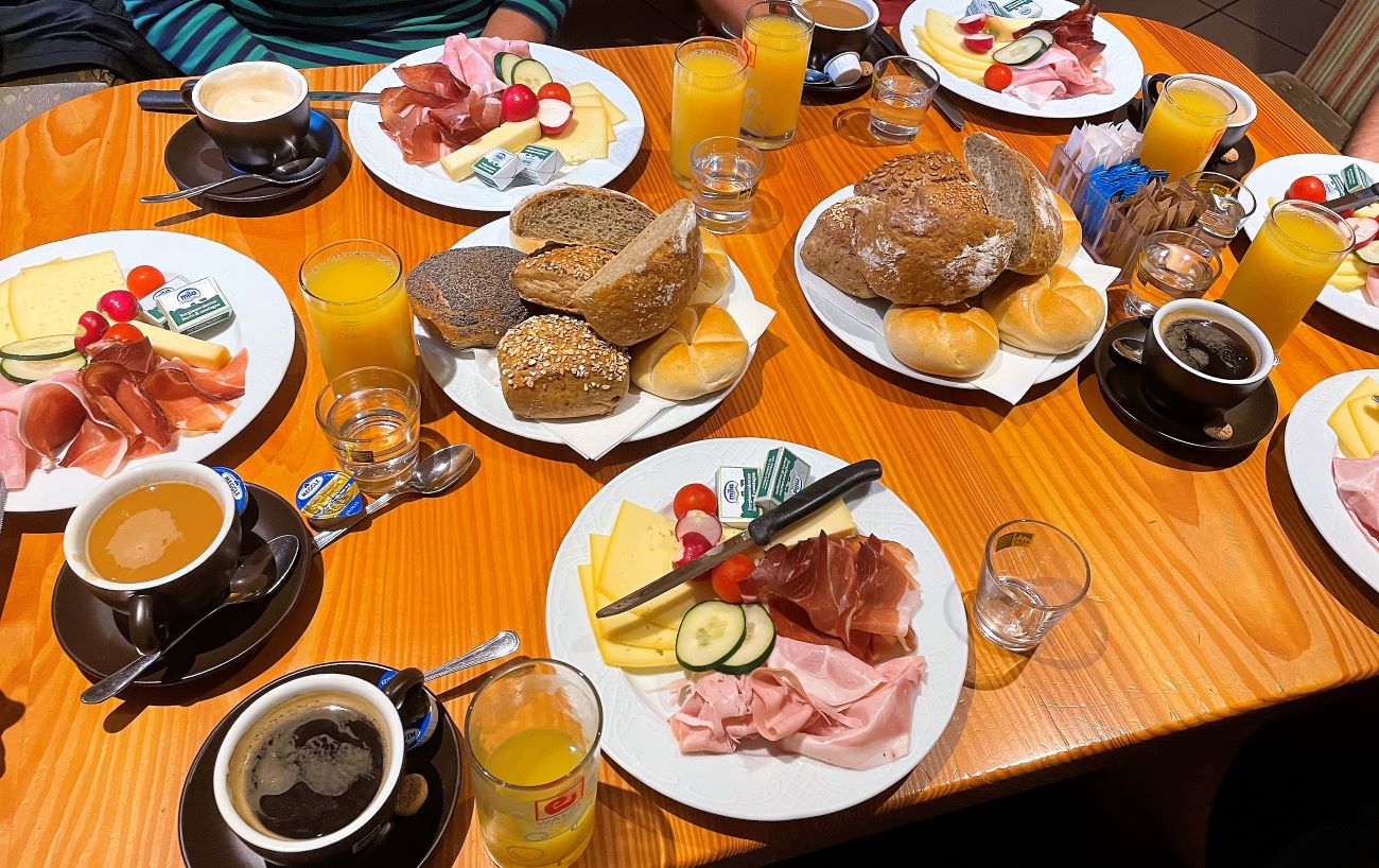 Auch zum geplanten Zeitpunkt für den Start dieser Etappe unserer Alpenüberquerung regnet es ausdauernd, der Himmel ist grau und verhangen, es hat sich deutlich abgekühlt. Das Regenradar sendet aber hoffnungsvolle Signale für den späten Vormittag. Wir beschließen, das bis dahin bei einem gemeinsamen ausgiebigen Frühstück auszusitzen.