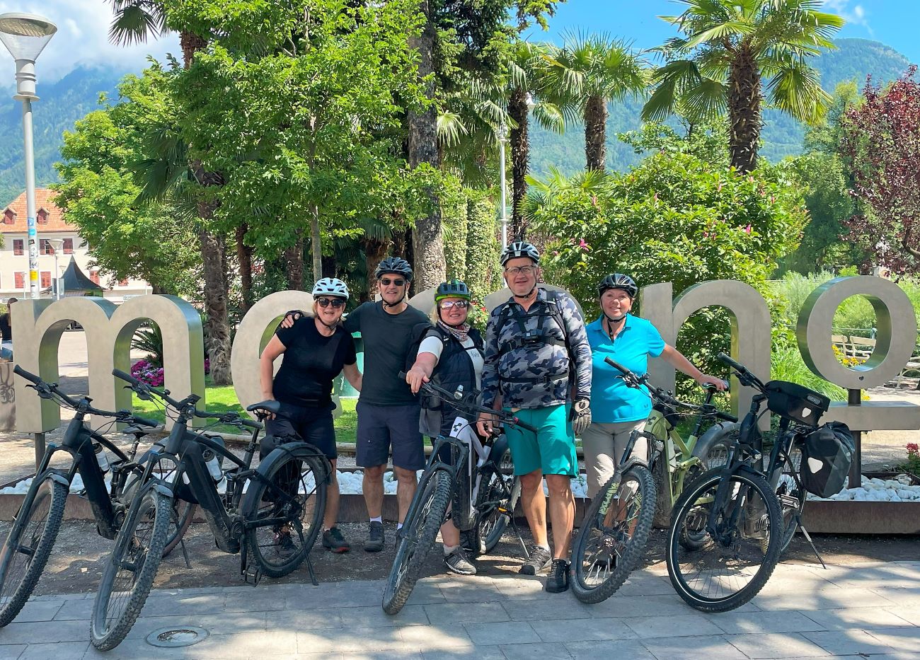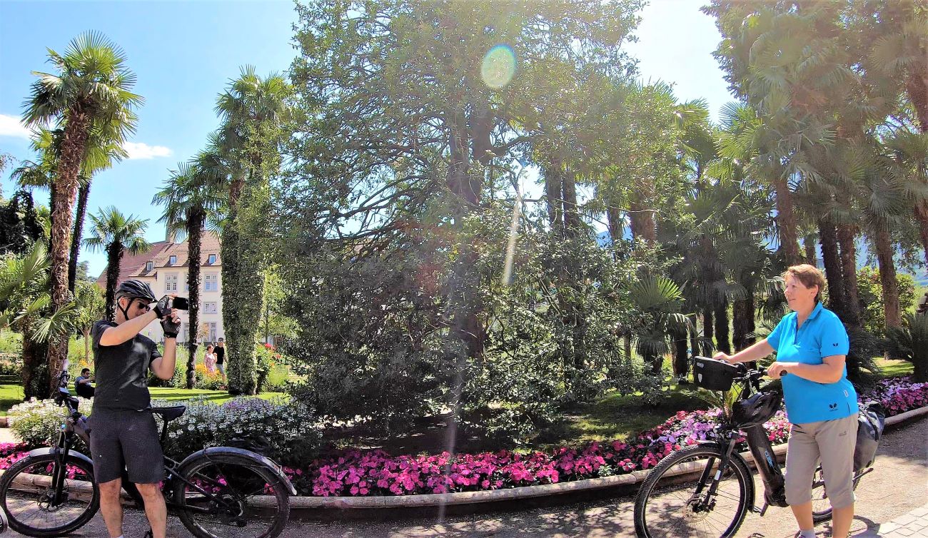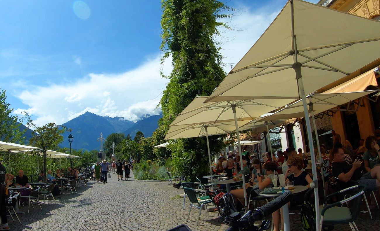 Trotz Verspätung, einen kurzen Abstecher nach Meran wollen wir auf keinen Fall auslassen. Die Stadt hat einfach etwas – die Promenade am Passer, das Kurhaus, das mediterrane Flair mit Palmen und Blütenpracht in Verbindung mit den hohen, z.T. noch schneebedeckten Bergen im Hintergrund wollen wir unbedingt bei inzwischen wieder schönem sonnigen Wetter auf uns wirken lassen.
