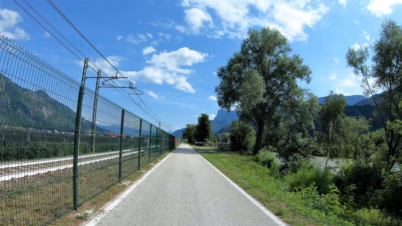 Charakteristisch für die Radwege im Etschtal sind bester Zustand, für meinen Geschmack fast ein bisschen zu gut, und weitestgehende Entflechtung vom Autoverkehr. Bestimmende Vegetation sind Apfelbäume, in weiten Passagen verläuft der Weg entlang der Etsch entlang eines Zauns oder Geländers, häufig auch neben der Bahnlinie.