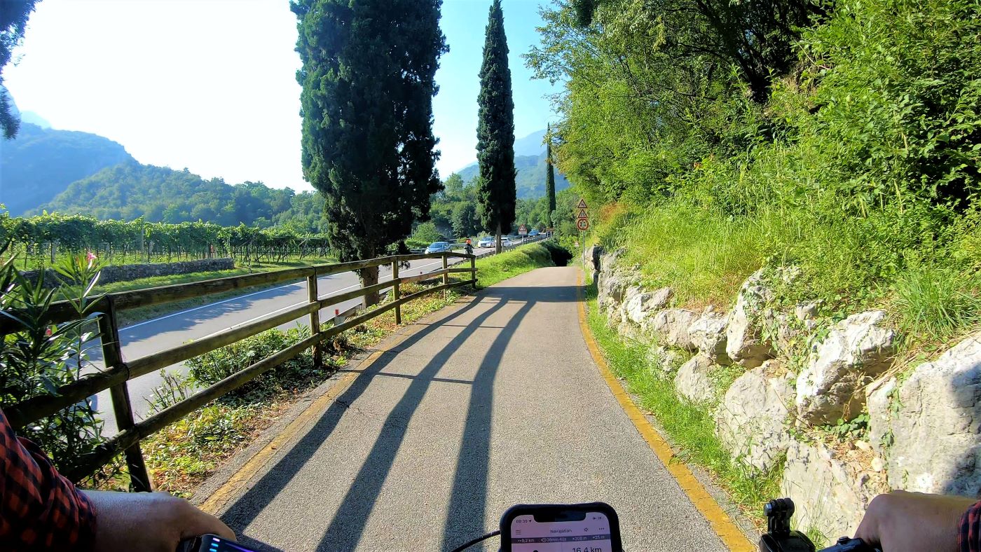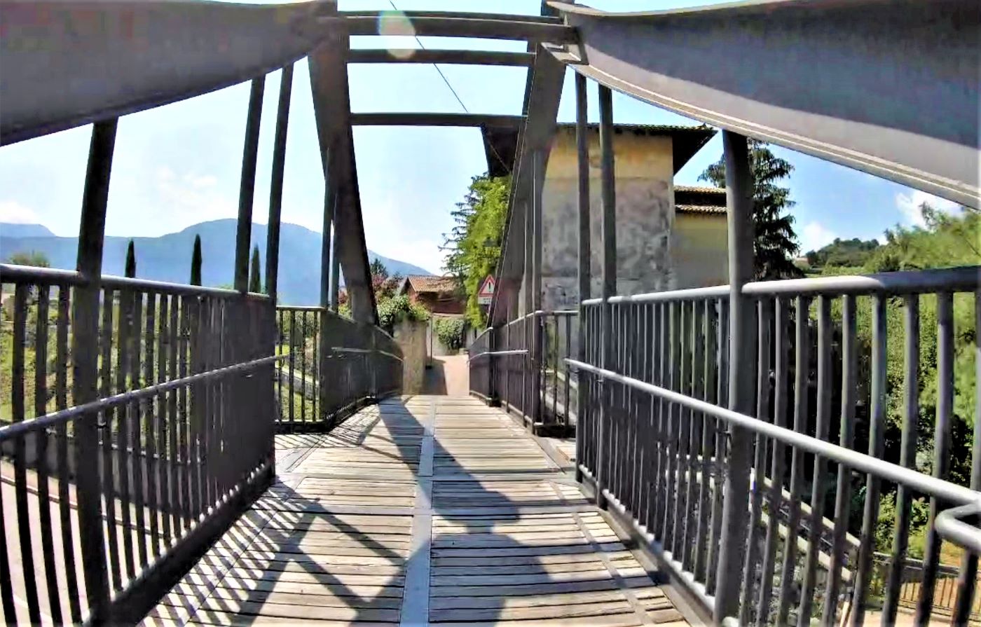 Also los – zunächst geht es nach einer kleinen Abfahrt über Nebenstraßen wieder runter an den Fernradweg an der Etsch. Wir fahren durch Rovereto, hier müssen wir etwas in den Ort einschwenken und passieren eine Brücke über die Straße.