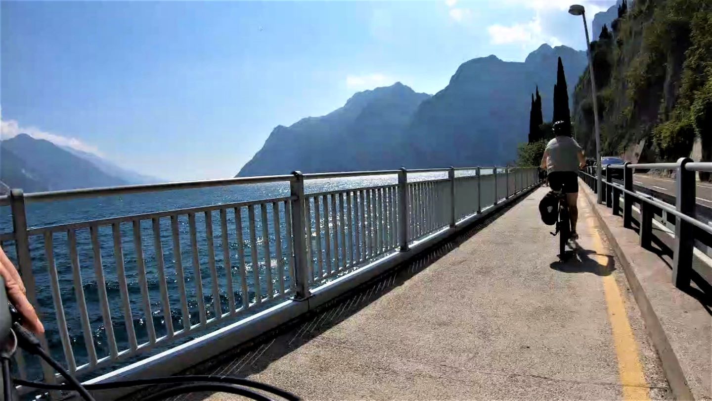 Torbole und das benachbarte Riva del Garda trennt ein kleines Felsmassiv. Hier verlagert sich der Radweg ausgesetzt und mit einem Geländer gesichert leicht erhoben über den See.