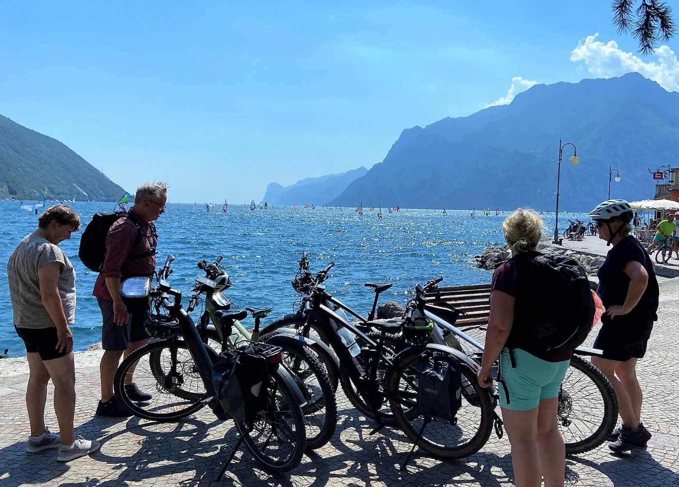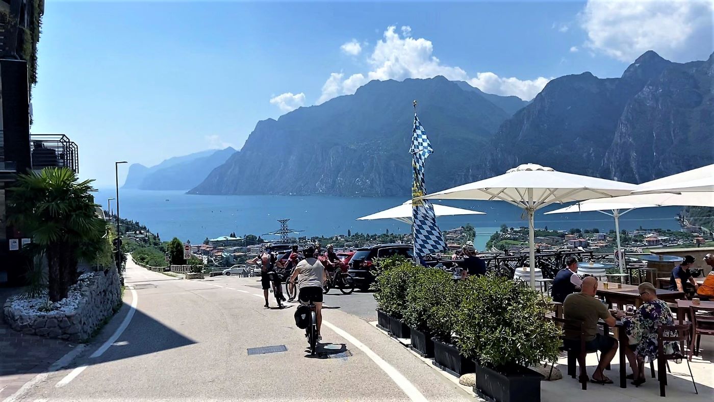 Schließlich nehmen wir die zunächst gerade verlaufende letzte Abfahrt unter die Reifen. Es fühlt sich nach Landeanflug an. Kurz bevor wir auf das Seeufer in Torbole stoßen, wird es etwas verwinkelt – dann stehen wir am Wasser und sind auch etwas überwältigt.