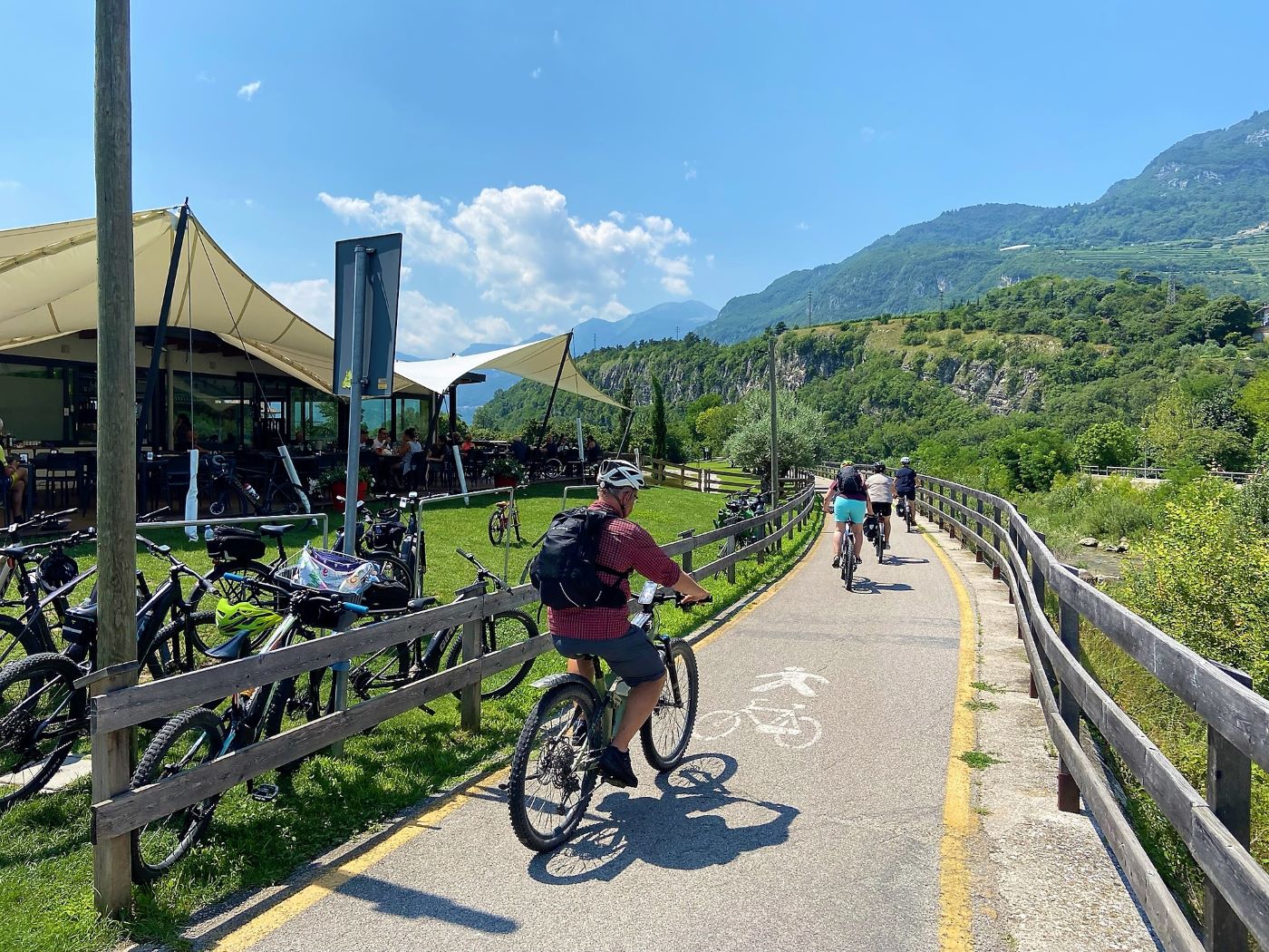 Nachdem wir einem kleinen Haken am Ortsaugang von Rovereto schlagen, um eine Brücke über einen Nebenfluss der Etsch nutzen zu können, machen wir eine letzte Pause an einem modernen, sehr ansprechend wirkenden Lokal. Hier sind sicher mehr als 90% der Gäste Radfahrer.