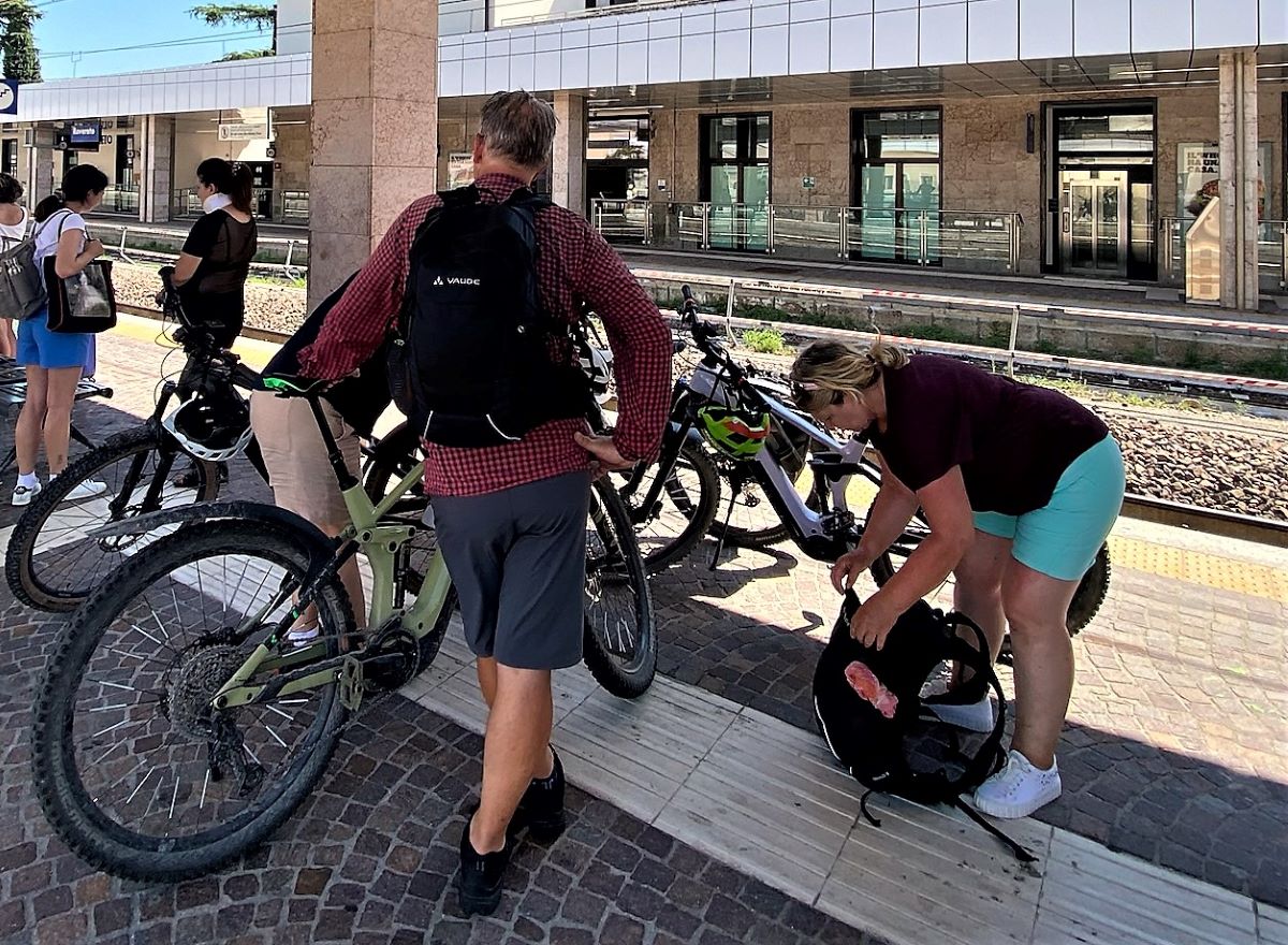 Wir hatten diese vorhersehbaren Probleme im Vorfeld ausgeräumt. Um auch gegen Überraschungen gewappnet zu sein, sind wir möglichst früh aufgebrochen, um auch bei einer eventuellen Reifenpanne noch Spielräume zur Reparatur zu haben. Da alles glatt lief, nutzten wir die reichlich verbliebene Zeit vor Abfahrt des Zuges gegen 11:30 noch für ein Frühstück auf der Terrasse des Lokals, das wir bei der vorherigen Etappe schon für den letzten Halt vor dem Gardasee genutzt haben.