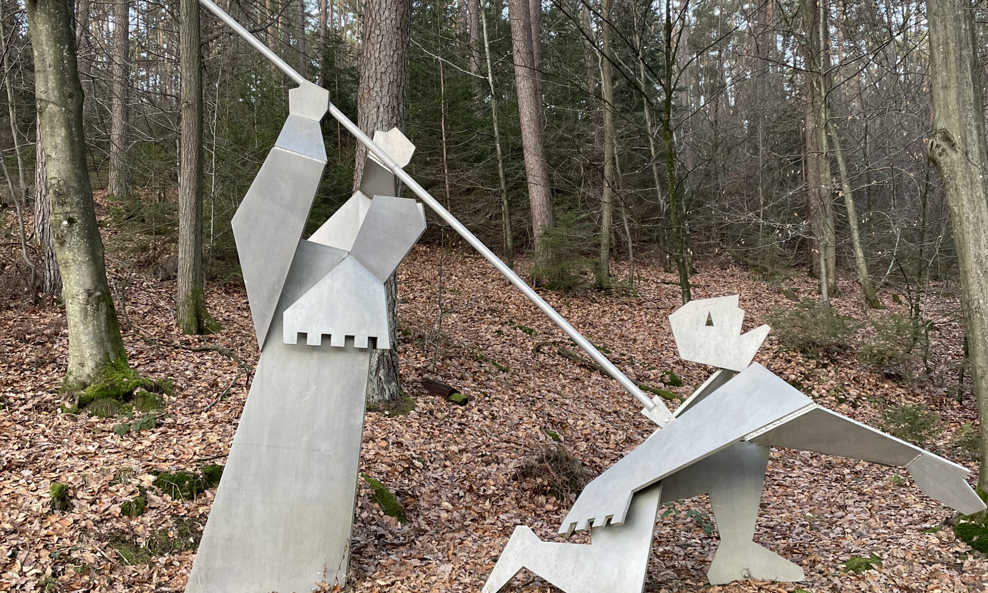Bereits in Sichtweite der Straße reklamiert der Lindelbrunnen mit einem modernen Kunstwerk aus Stahl (siehe Titelbild dieser Seite) im Wettbewerb für sich sehr markant der Tatort der Tragödie zu sein. Wir nähern uns von oben aus dem Wald und machen uns ein eigenes Bild.